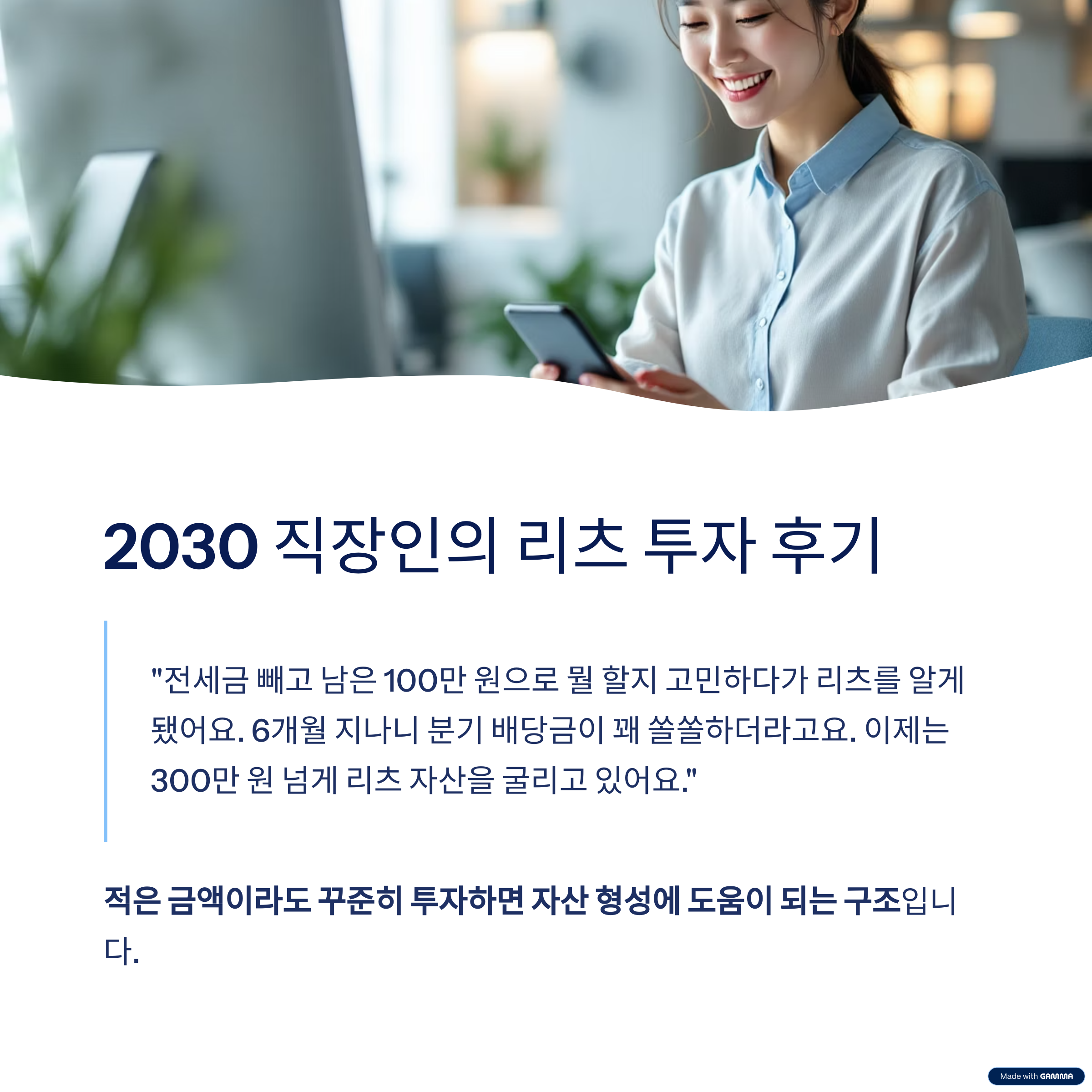 "์ ์ธ๊ธ ๋นผ๊ณ ๋จ์ 100๋ง ์์ผ๋ก ๋ญ ํ ์ง ๊ณ ๋ฏผํ๋ค๊ฐ ๋ฆฌ์ธ ๋ฅผ ์๊ฒ ๋์ด์.