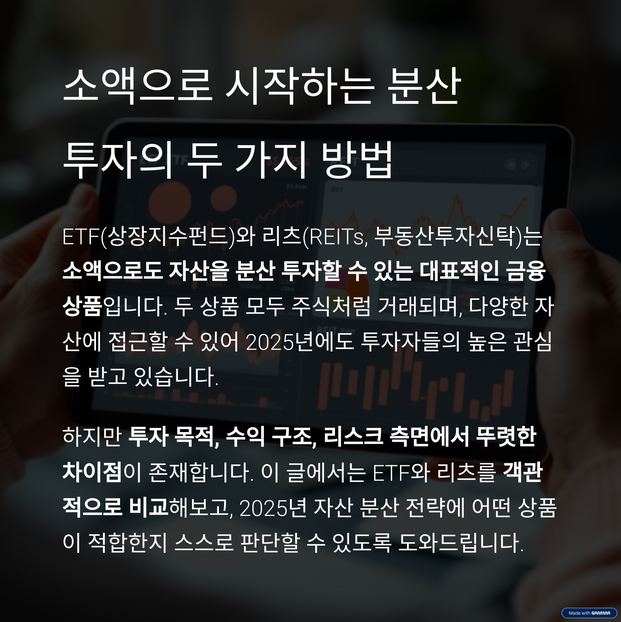 ETF(μμ₯μ§μνλ)μ λ¦¬μΈ (REITs, λΆλμ°ν¬μμ ν)λ μμ‘μΌλ‘λ μμ°μ λΆμ° ν¬μν μ μλ λνμ μΈ κΈμ΅μνμ